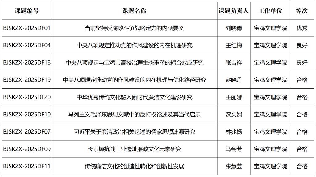 据悉,党风廉政建设理论与实践研究专项课题共受理结项申请21项,经专家严格评审、综合评议,最终确定20项课题准予结项。结项课题按成果质量划分为三个等次,其中优秀等次3项、良好等次5项、合格等次12项。
