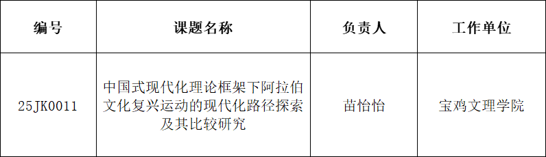 近日,陕西省教育厅发布了《关于印发2025年度科研计划的通知》(陕教函〔2025〕1131号),必赢官网苗怡怡博士负责的《中国式现代化理论框架下阿拉伯文化复兴运动的现代化路径探索及其比较研究》获准人文社会科学专项立项,项目经费1万元。