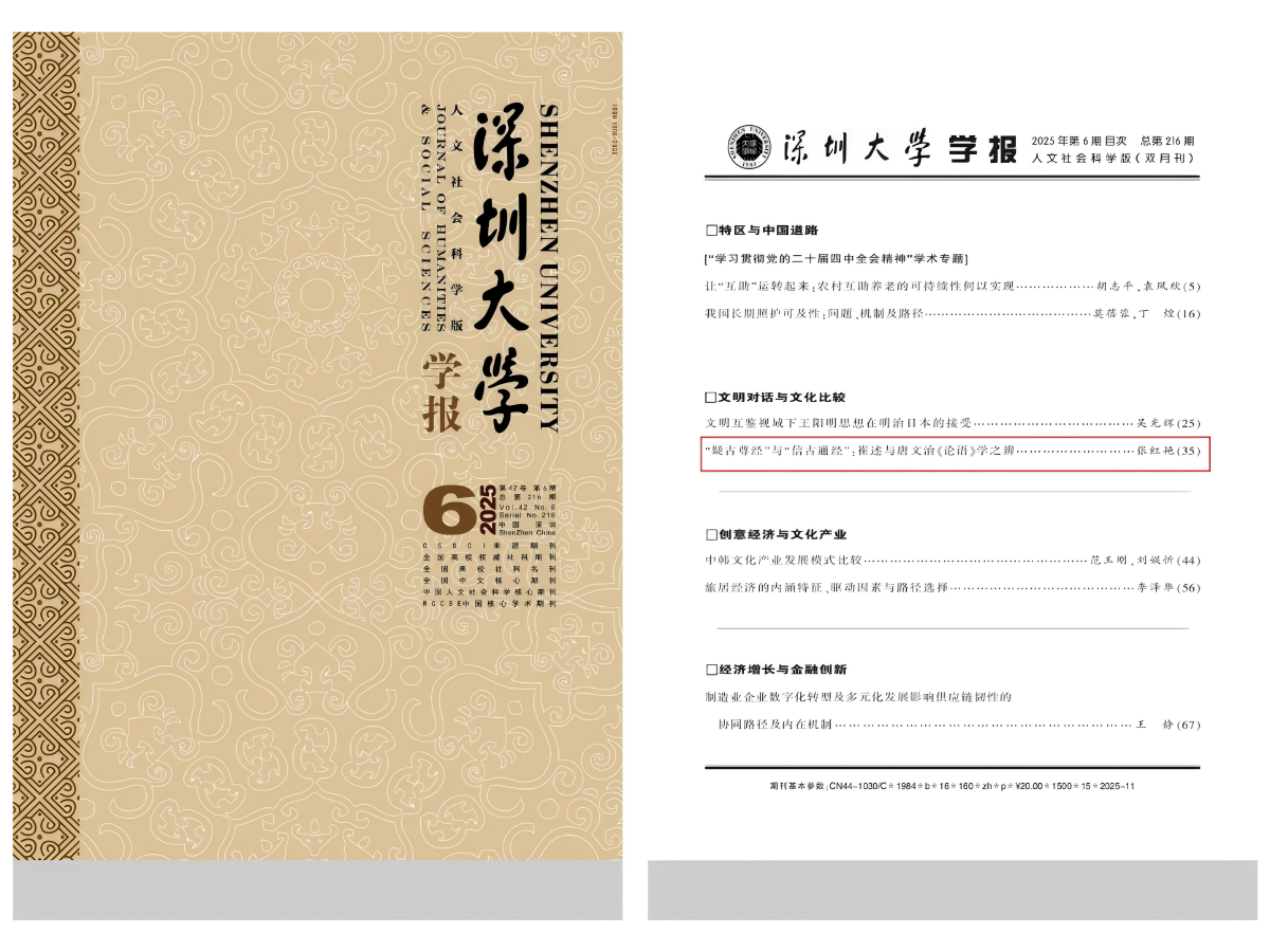 近日,必赢官网张红艳副教授撰写的学术文章《“疑古尊经”与“信古通经”:崔述与唐文治<论语>学之辨》在CSSCI期刊《深圳大学学报(人文社会科学版)》2025年第5期刊出。该期刊为深圳大学主办的CSSCI来源期刊,我校为论文的独立完成单位。